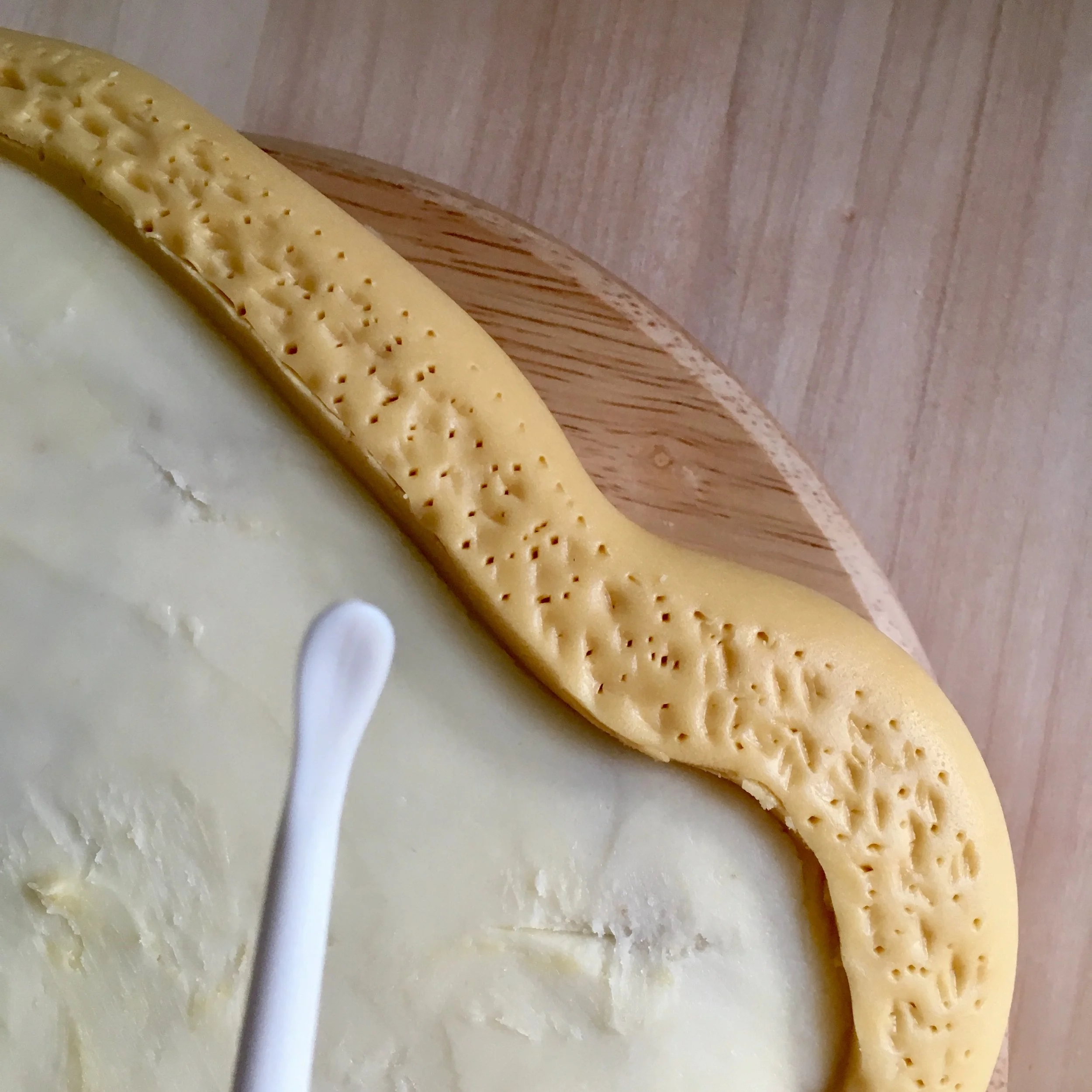 20. Using a veining tool or a large needle pick little holes all over the remaining fondant that’s on top of the cake. Then, go over these with a dresden tool or the handle of a teaspoon to create the toast texture.